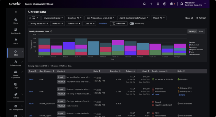 AI Agent Monitoring in Observability Cloud ensures teams can pinpoint and correlate the root cause of unreliable or degraded AI agent and model performance. Teams can evaluate responses and track performance metrics such as latency and errors alongside quality and security metrics like hallucinations, bias, drift, and accuracy, as well as cost and token usage metrics.
