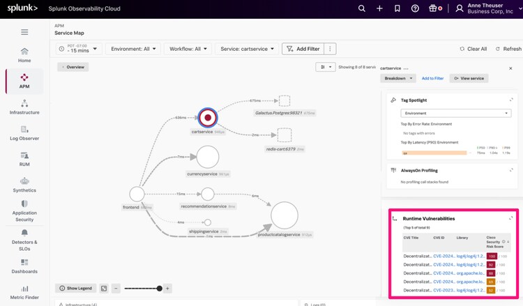 Secure Application in Splunk Observability Cloud helps engineering teams improve SLA compliance and reduce application security risks without the need to deploy and manage additional agents. By embedding runtime application security directly into observability data, teams can detect vulnerabilities within code in real time and map them directly to application services, including open-source frameworks and third-party libraries, to prioritize and quickly respond to critical risks. This means you’re always protected against the latest risks, without manually checking every package or waiting for the next scan.