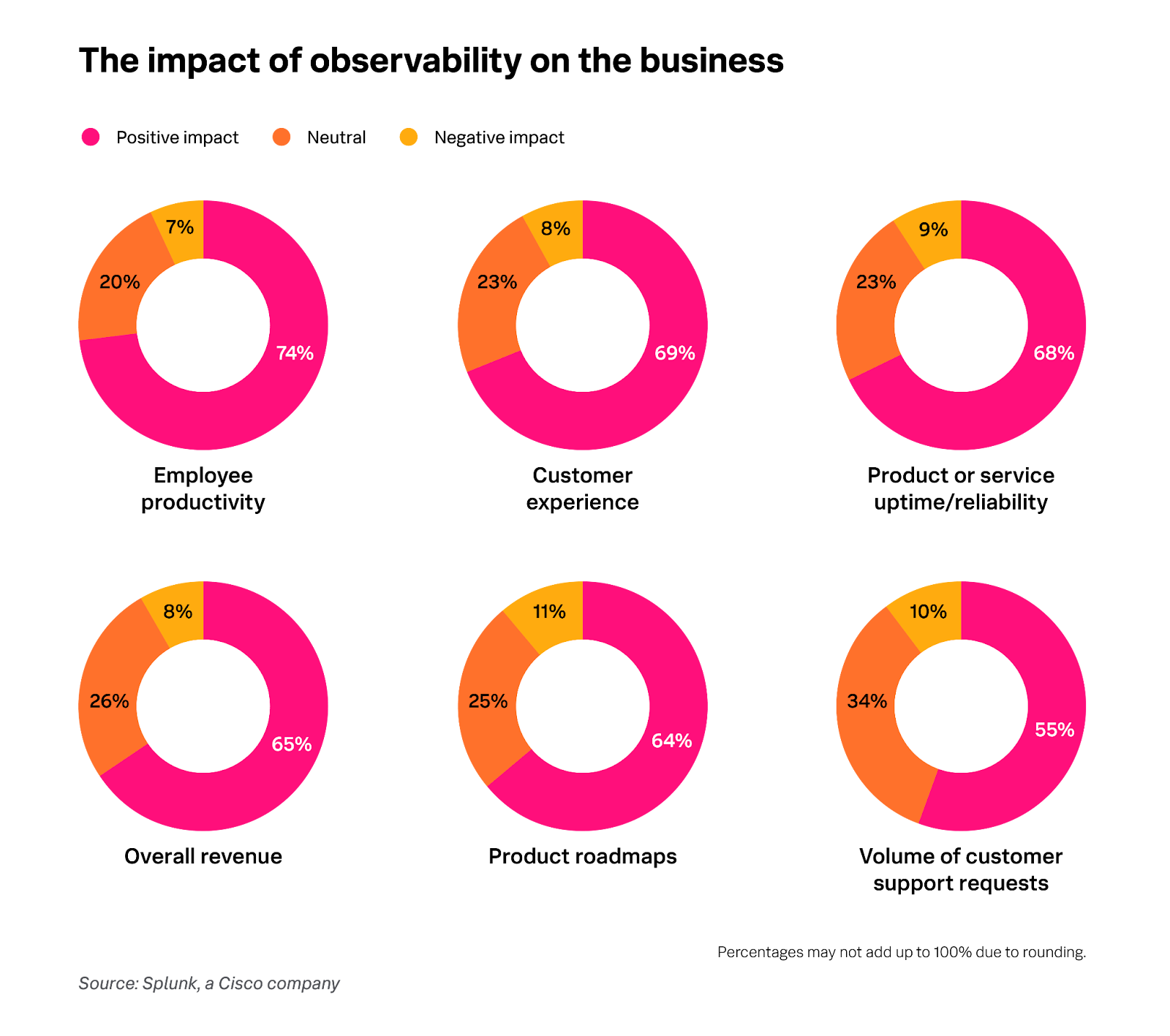 These shifting priorities have paid off; 65% of respondents say their observability practice positively impacts revenue, and 64% say their observability practice positively impacts product roadmaps.