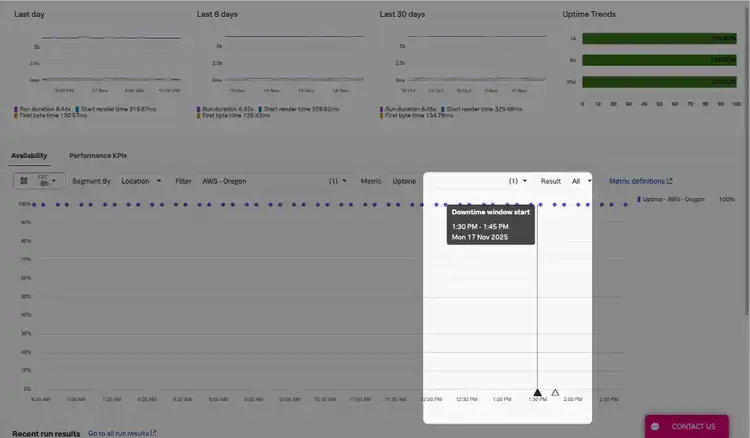 During releases and maintenance, synthetic tests behave correctly by detecting slow pages, inconsistent flows, and temporary failures. The challenge is that these signals are expected during maintenance windows. If you treat them like real incidents, you end up with false alerts, polluted dashboards, and misleading performance trends.