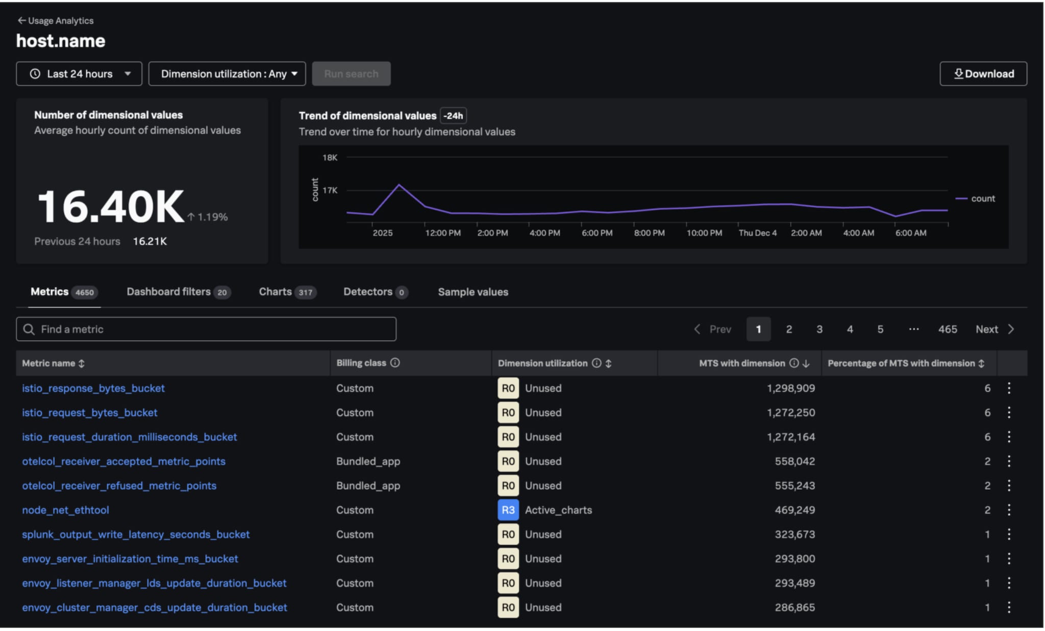You've successfully dropped or archived unused metrics with Metric Pipeline Management but still find your telemetry bill higher than expected. The likely culprit? High-cardinality dimensions. These are dimensions that generate a vast number of unique values, leading to an explosion in Metric Time Series (MTS) count. Imagine a dimension like user_id in a system with millions of users, or request_timestamp that changes with every single event. While seemingly useful, such dimensions can:
