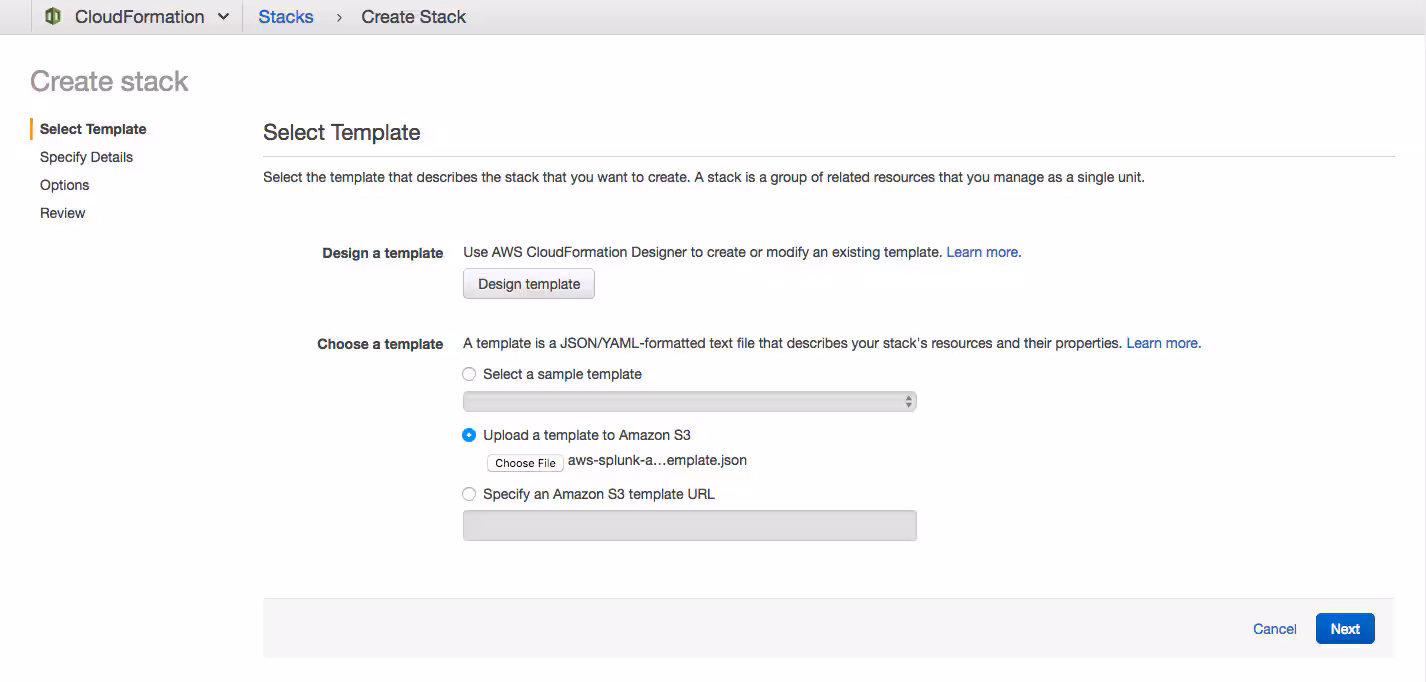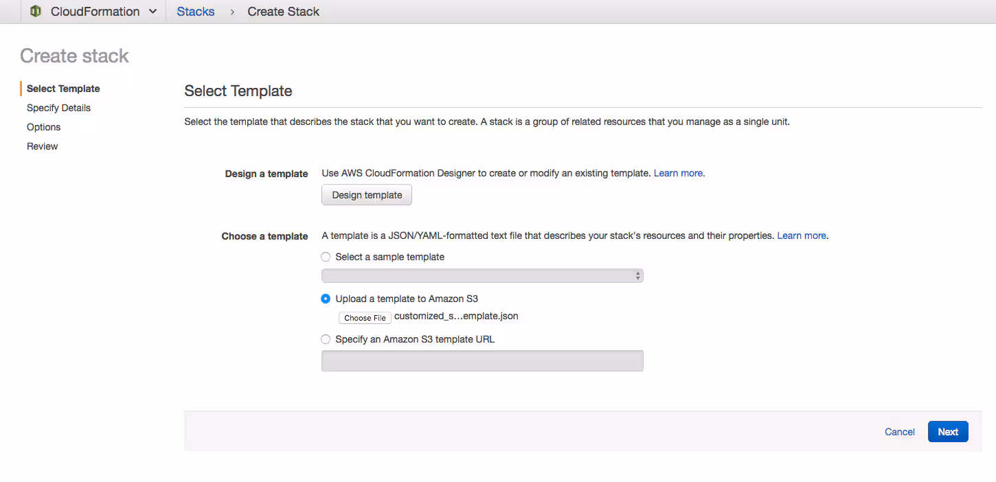 To deploy the downloaded custom template from the AWS CloudFormation console, click “Create Stack,” and upload the downloaded template. Then click “Next.”