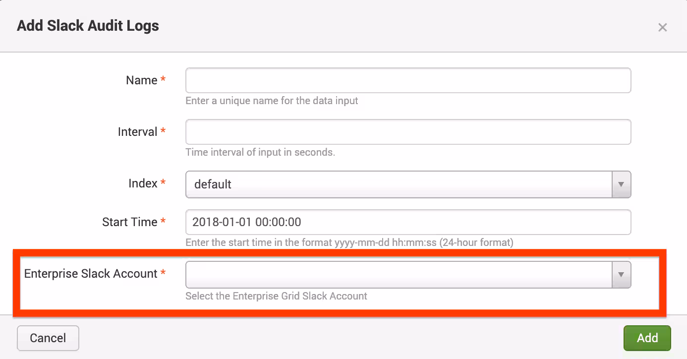 - Index (required): Select the index from the dropdown list. Set the default index to be slack_audit, if using in conjunction with the Slack Audit App for Splunk.