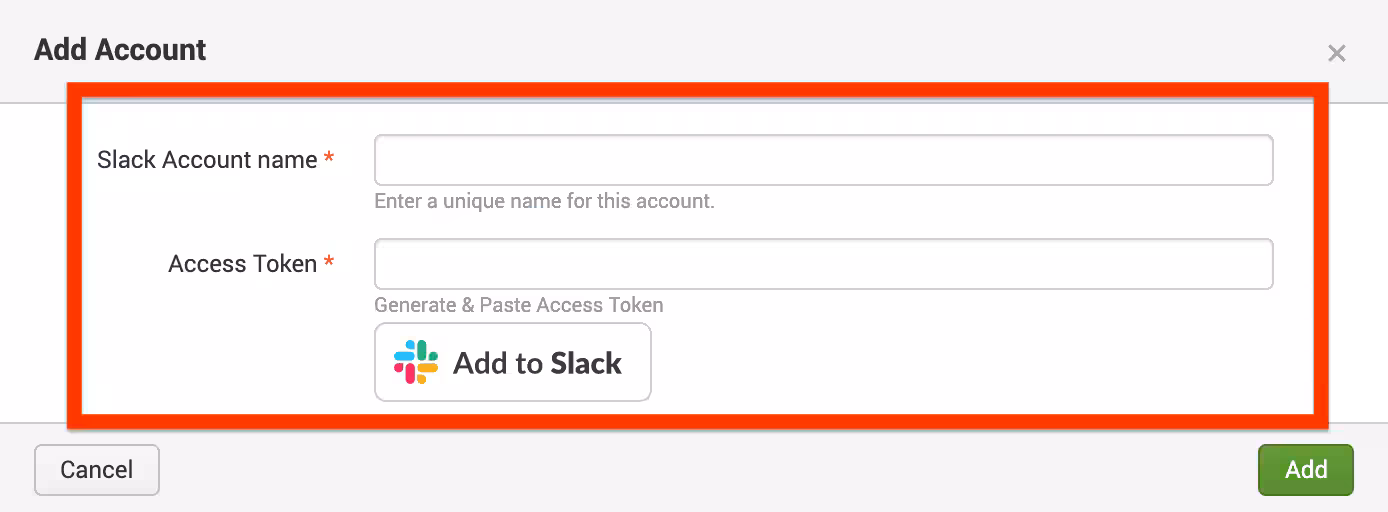 5. Access Token (required): See the “Generate Access token” section below for detailed instructions on how to generate this. Alternatively, you can bring your own xoxp-token with the auditlogs:read scope. Please contact your Slack account team or feedback@slack.com (Opens in new tab) for up to date instructions on how to generate the token.