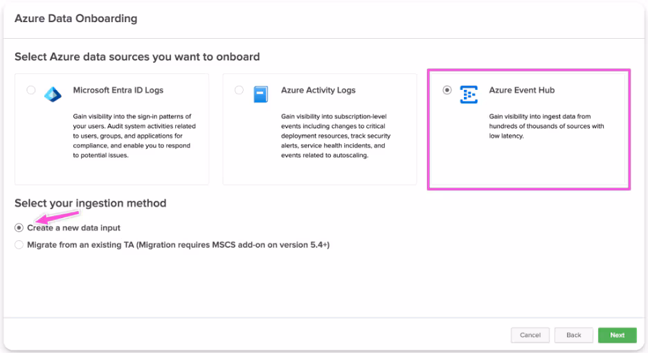 - You can find all prerequisites in Data Manager (New Input -> Microsoft Azure-> Azure Event Hub -> Migrate from an existing TA (Migration requires MSCS add-on on version 5.4+) -> Prerequisites for Onboarding Azure Data)