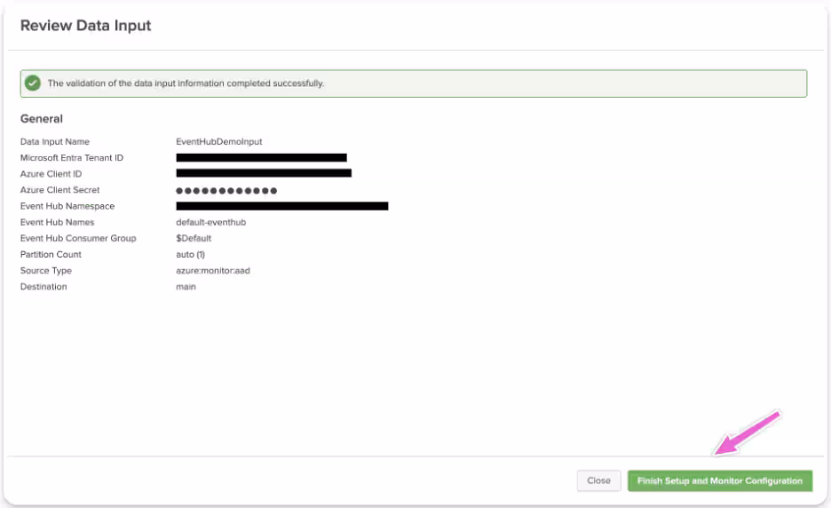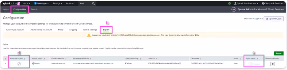 Verify the existing setup:- Confirm that your Event Hub inputs are set up and actively pulling data into Splunk via the Splunk Add-on for Microsoft Cloud Services.