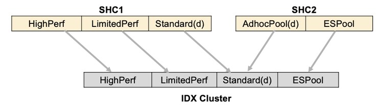 On a search head, a search is started in the workload pool specified by the workload rules. The search looks for the same pool name on indexers as specified on the search head. If that pool does not exist on the indexers, it runs in a default search pool on indexers. The example below shows the mapping of searches placed in different workload pools on search heads to the workload pools on indexers. The default search pools are denoted by suffix (d). Because the AdhocPool does not exist on IDX cluster, any search placed in that pool on SHC2 will run in the Standard pool (default) on IDX.