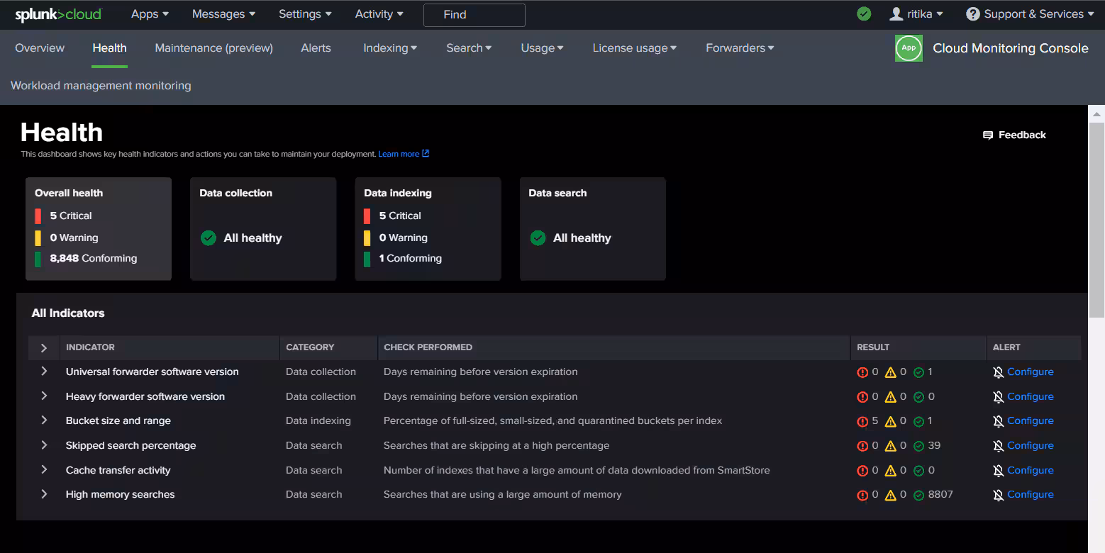 CMC’s new Health Dashboard is generally available (GA) now starting with CMC 3.10.2. Health Dashboard is a single place for you to view critical indicators that impact the overall health of your Splunk Cloud deployments. With the Health dashboard, you get actionable insights about your deployment, allowing you to proactively get ahead of any potential issues. You can now track six health indicators (Universal forwarder software version, Heavy forwarder software version, Bucket size and range, Skipped search percentage, Cache transfer activity, and High memory searches) categorized by current state (critical, warning, conforming) and get informed about next steps you can take to maintain optimal performance using the new CMC Health dashboard.