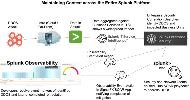 Imagine tying together context from all of your tools into a single developer friendly interface like Splunk Observability Cloud. The diagram below pictures each of the previously mentioned Splunk tools passing along context on their part of responding to a DDOS incident.