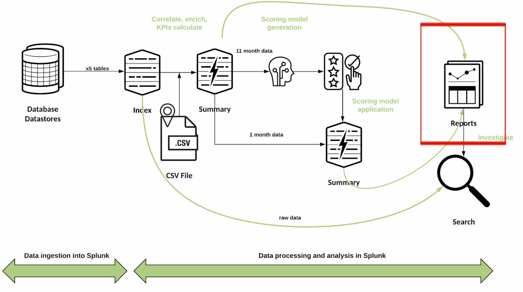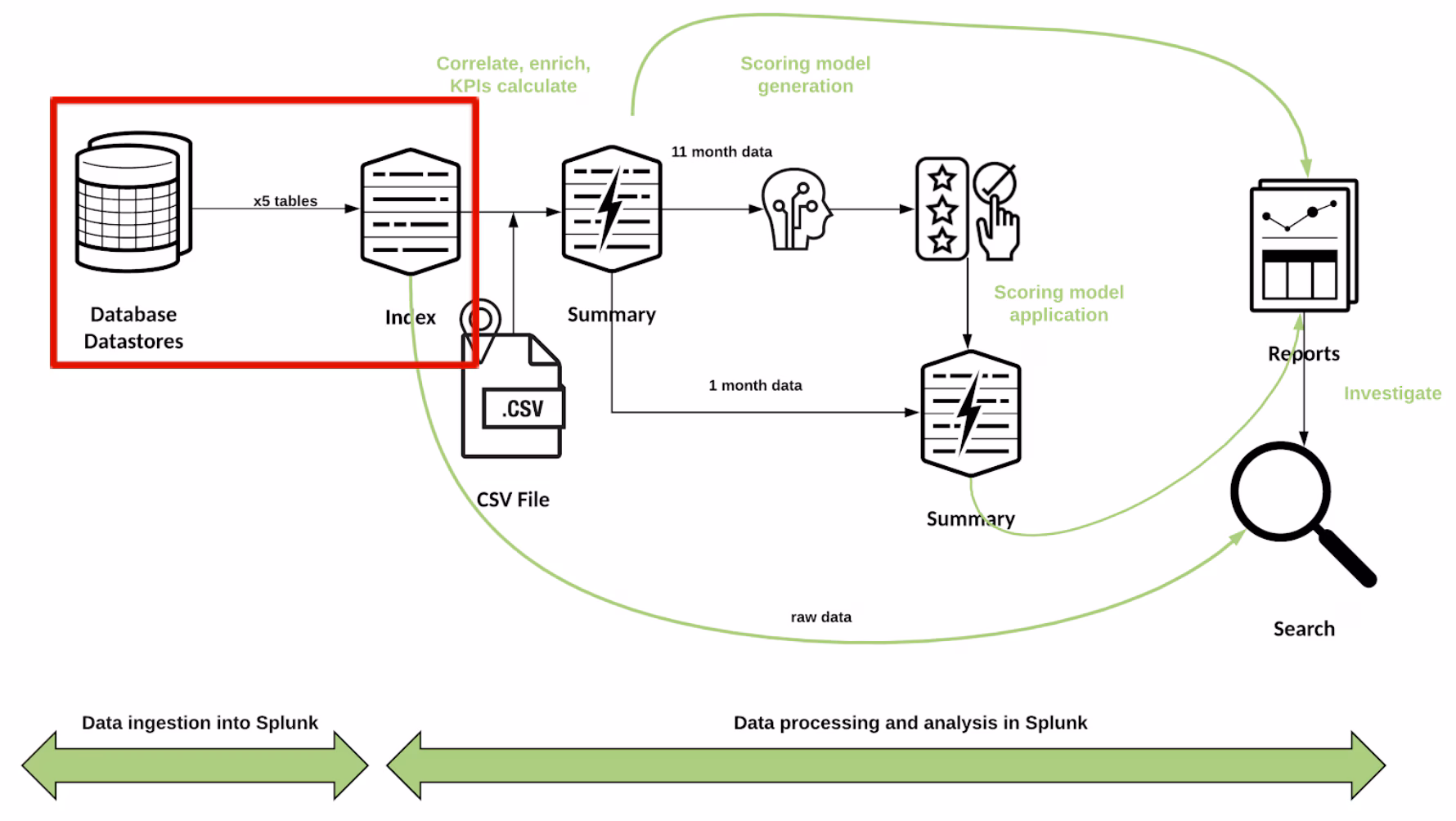Note that since the data enters Splunk, the data pipeline depicts transformations in the data itself and not the underlying HW/SW architecture. In order to perform the various transformations in the data (indexing, enriching, summary, ML) only the indexer and search head components of Splunk’s super scalable architecture are required and only SPL language will be needed across the data pipeline. These make the solution simpler to build and maintain than other data pipelines made of different pieces of SW.