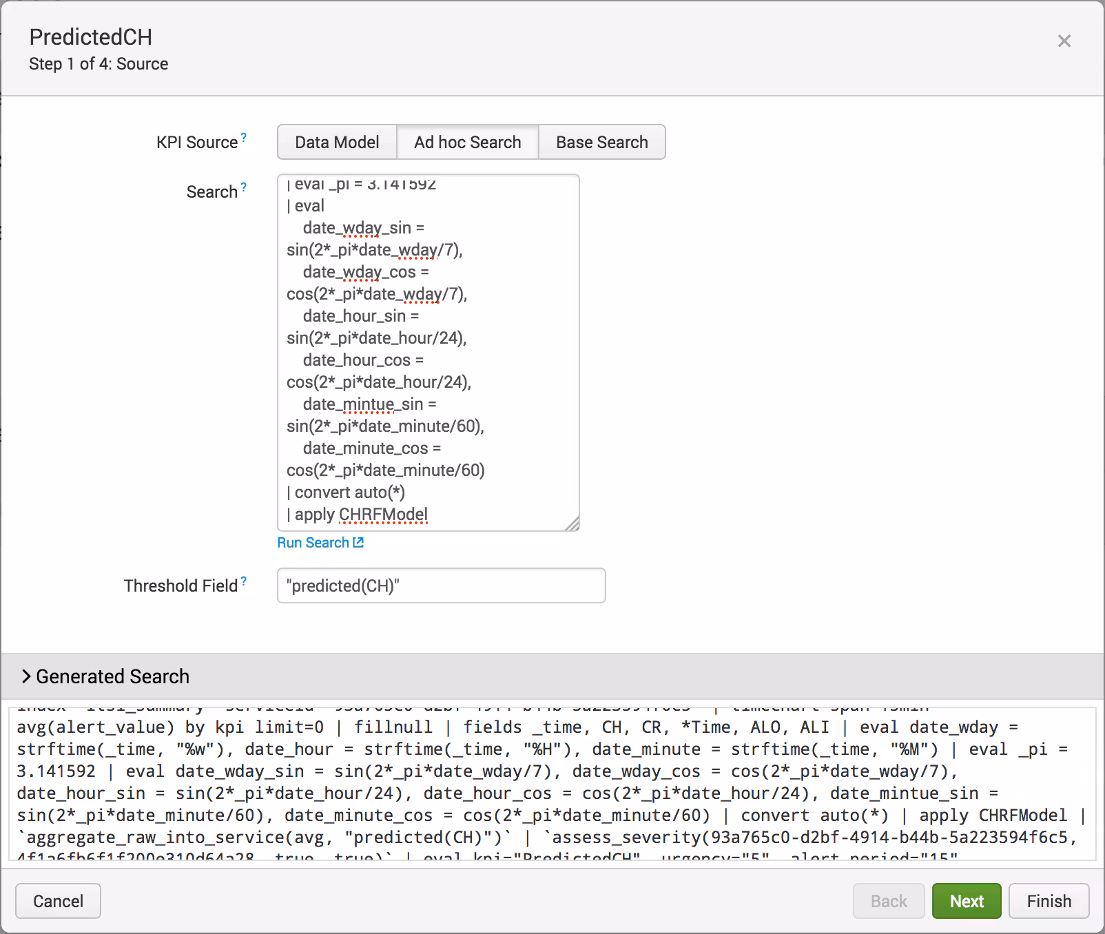 Under the KPI tab, we choose Generic KPI from the 'new' dropdown menu. Let's call this KPI PredictedCH. The following search applies the CHRFModel model on the data and produces a new field called 'predicted(CH)'.