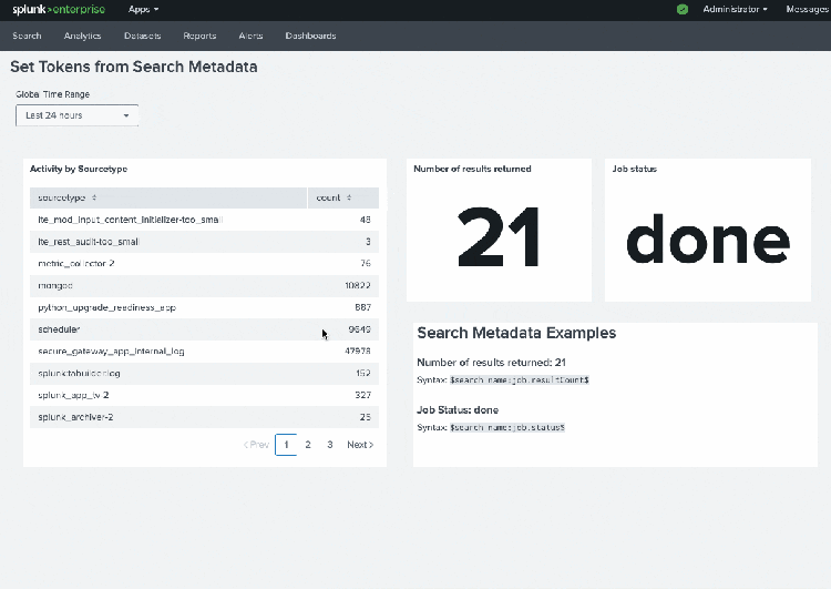 The syntax generally follows the format: $search name:job.<metadata>$. In the example above, in order to retrieve job status for my data source, "Activity by Sourcetype", I used the following token: $Activity by Sourcetype:job.status$. If I wanted to render my search results directly in my dashboard, I could use the syntax $search name:result.<fieldname>$ to render the first row of the specified field. In this scenario, I could use $Activity by Sourcetype:result.count$, which would render the first row of the 'count' field.