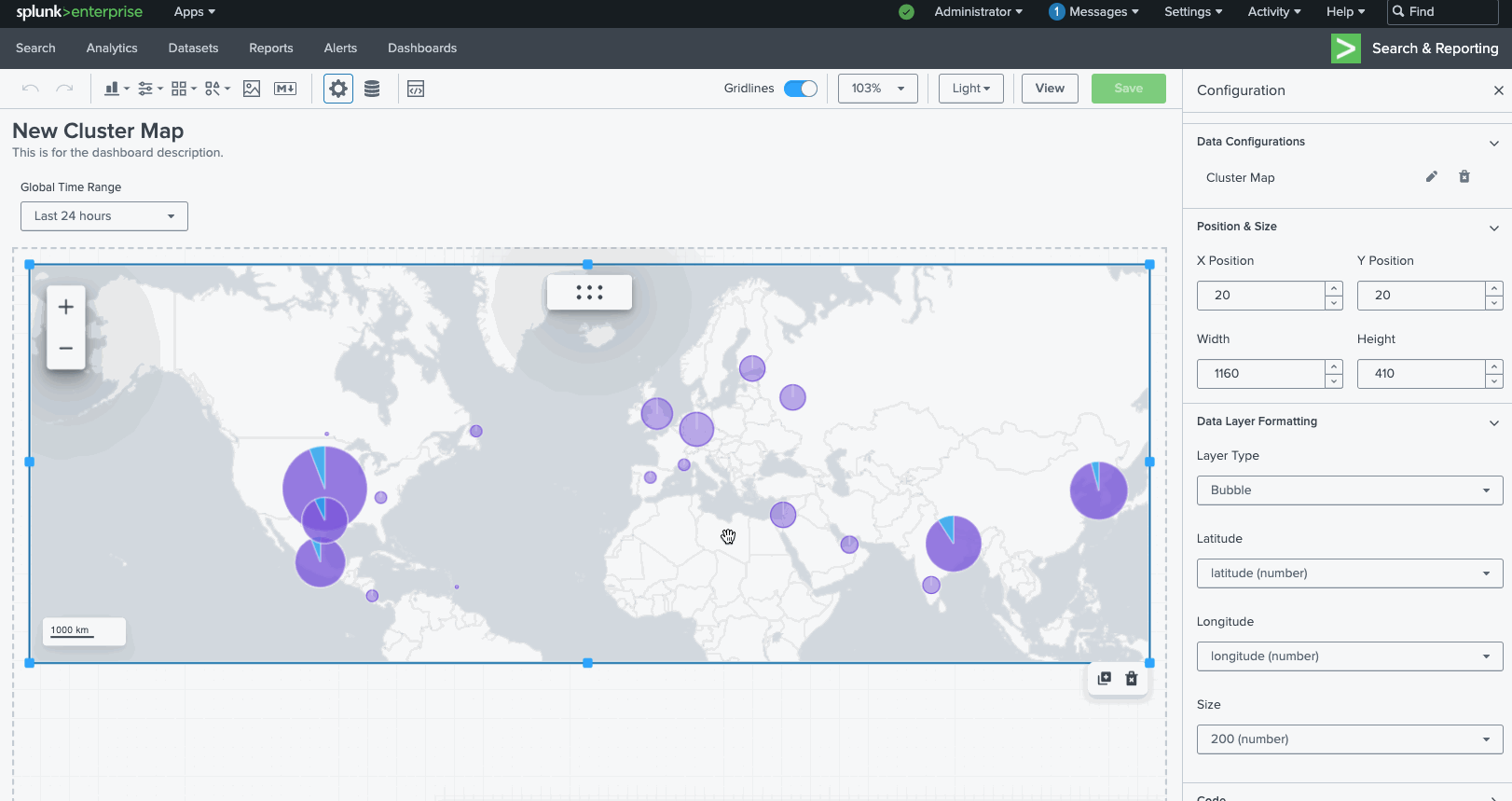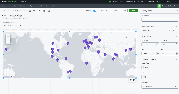 This release also comes with a new visualization: splunk.map which will enable you to display bubble and marker maps on the dashboard. This bubble map example uses the traditional geostats command.