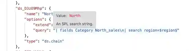 In the prior switch to tab example, we needed to use the source editor to modify the event handler to use a token ("tabID": "layout_$region$"). In this scenario, it's important to ensure that the token value returned actually matches the tabID (for example, layout_west versus layout_West). Previously, the only way to do this would be to go back to the UI editor and manually check the token value. Now, you can see a token's value by simply hovering over it in source. In the below screenshot, "Value: North" is displayed when hovering over $region$ in the SPL query.