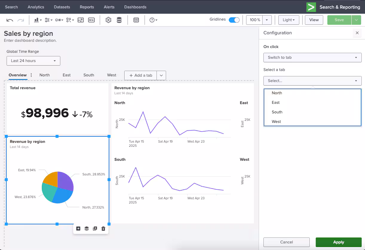 In the source code, you can dynamically select a tab with the use of tokens. In this example, the dashboard has been configured such that when a user selects a slice of the pie chart, they will be taken to the respective tab. First, each tab's ID is updated to include the region name in source (for example: "tabID": "layout_west"). Then, the pie chart's event handler is populated with the tabID based on the selected pie slice: