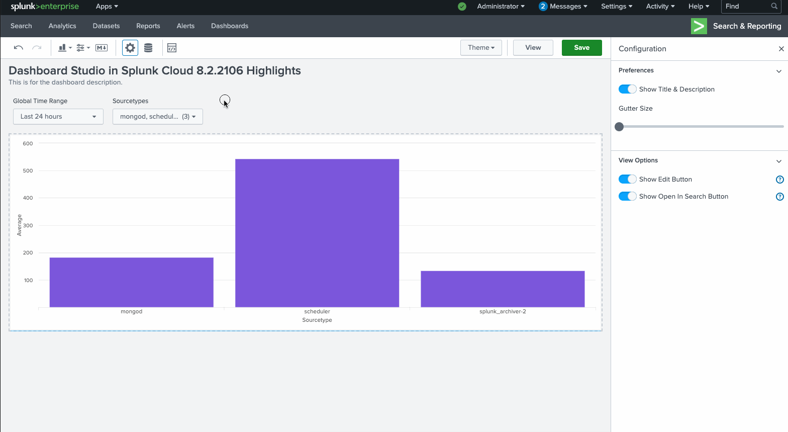 If you have ever unintentionally switched from Edit to View mode without saving your changes, you're not alone. With Splunk Cloud Platform 8.2.2106, we've made it easier to make sure you don't lose your work by moving the Save button to the right side of the toolbar, and right next to the View button. We've also added a toast message any time you switch from Edit to View mode with unsaved changes, and a quick link to save your dashboard.