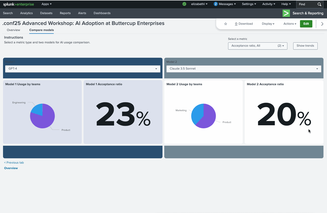 For example, in this dashboard from our .conf25 workshop, Dashboard Studio for Experts and Advanced Users, users can choose what data they want to see and whether they want to view the KPI metric or historical trend.