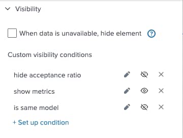 Once you've created your condition, you can associate one or multiple conditions to an object under the Configuration panel's Visibility section. Next to each condition is an eye icon. A clear eye means "show" and an eye with a strikethrough means "hide" when the condition is met.