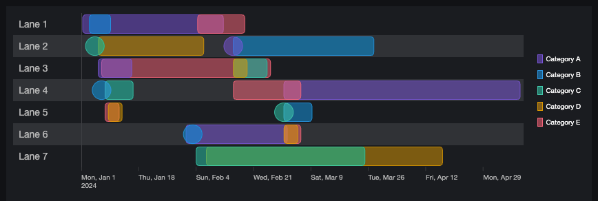 We have added native support for Timeline visualization, which displays activity intervals and events over time for a set of resources. Timeline visualization is great for visualizing sequences of events or overlapping activities and ensuring consistent time scaling. Use Timeline visualization for tracking resource utilization, project timelines, or event patterns over time.