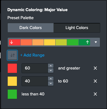 You can select from predefined color palettes or you can customize a color palette by specifying HEX values. You can select between light color palettes (recommended for dark mode dashboards) or dark color palettes (recommended for light mode dashboards). You can add or remove ranges, and if you want to flip the order of the colors, there's a button for that!