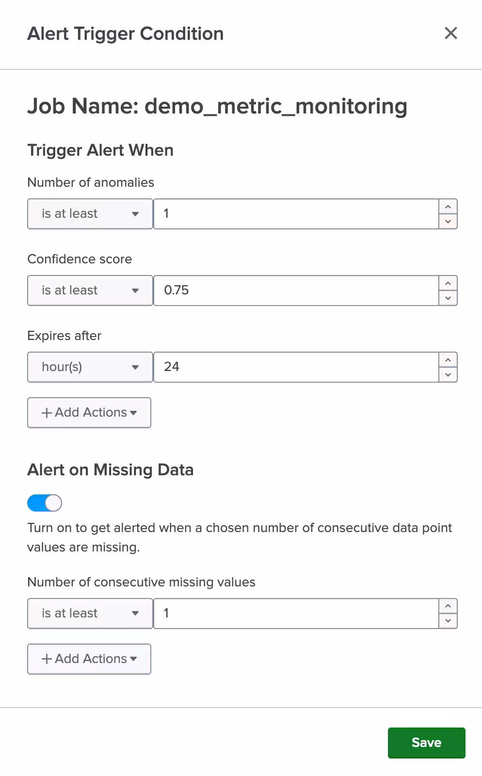 An added benefit of modularizing the timestamp handling in this way is that it provides us with explicit control over how missing data should influence the alerts that a user ultimately receives. When the user operationalizes their anomaly detection job, they can configure alerts both on the detected anomalies as well as on missing data that occurred in the new data that arrived at the index being monitored since the job was configured. Missing data alerting is a new capability not previously delivered within Splunk that is enabled via a custom search command that our team developed. The custom search command scans the data and returns the maximum number of consecutive data points that are missing; then, the user can set up alerting on that maximum number of missing data points in a row, as shown in the following image of our alert setup dialog.