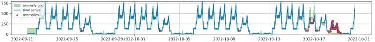 For example, the time series below exhibits a weekly pattern, with two anomalies: one on 2022-10-17, characterized by lower-than-normal activities, and another on 2022-10-19, featuring unusual activities on a day that is typically inactive.