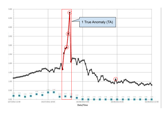 Example illustration of metrics; circles indicate an algorithm's detections. Algorithm detected 1 anomaly (consisting of 3 consecutive points) inside the TA => 1 True Anomaly Detected (TAD), 1 True Positive (TP). Algorithm detected 1 anomaly outside the TA => 1 False Positive (FP)