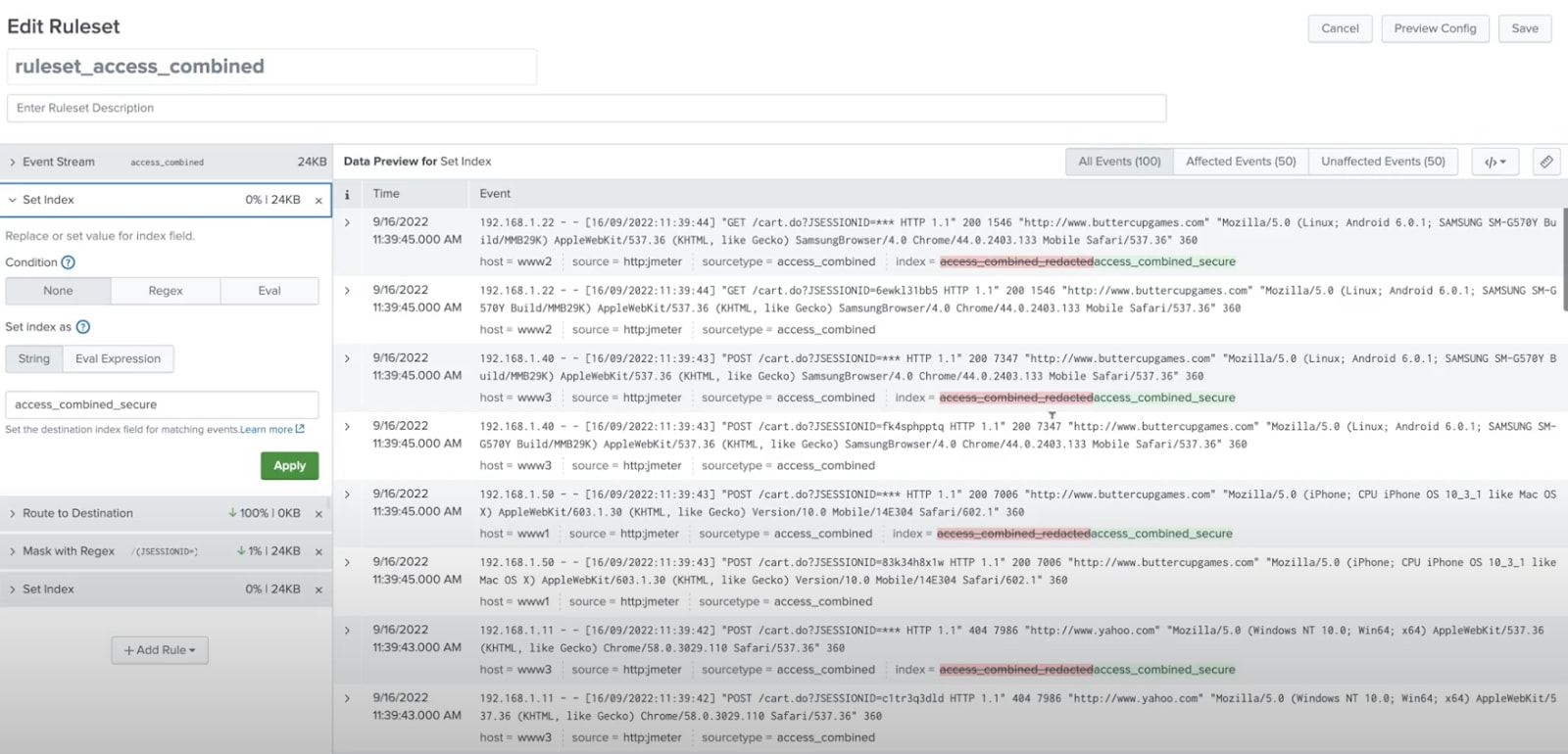 One of our release updates following last year’s general availability launch included the ‘set index’ capability which allows you to dynamically route data to different indexes. With that, you can set or replace the index field based on the data stream’s sourcetype by regex or eval statement. The index name itself can be a static string, or dynamically defined by another set of evals, so you’ve got tons of flexibility to write the rule(s) that you need. Check out this Tech Talk to view a full demo of this capability.