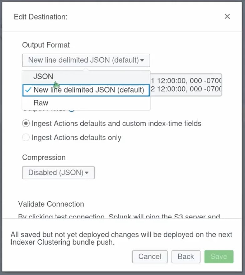 Not only will it be easier to route select data to S3, but with the upcoming Q3 release of Splunk Federated Search for Amazon S3 , it'll be even easier to search that data without having to ingest it back into Splunk. In anticipation of that release, we’ve enabled several partitioning options to better organize your data and to optimize the performance of your federated searches. Additionally, we added more formatting options like new-line delimited json (the new default for new S3 destinations) and _raw output to give you more flexibility on how you want the exact output to look.