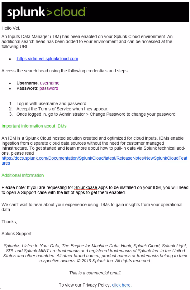 If your stack is provisioned after IDM’s General Availability in August 2019, you should already have IDM on your stack. The URL for IDM would be in the format https://idm-<yourstackname>.splunkcloud.com. If you have not obtained it, please contact your Account Manager.