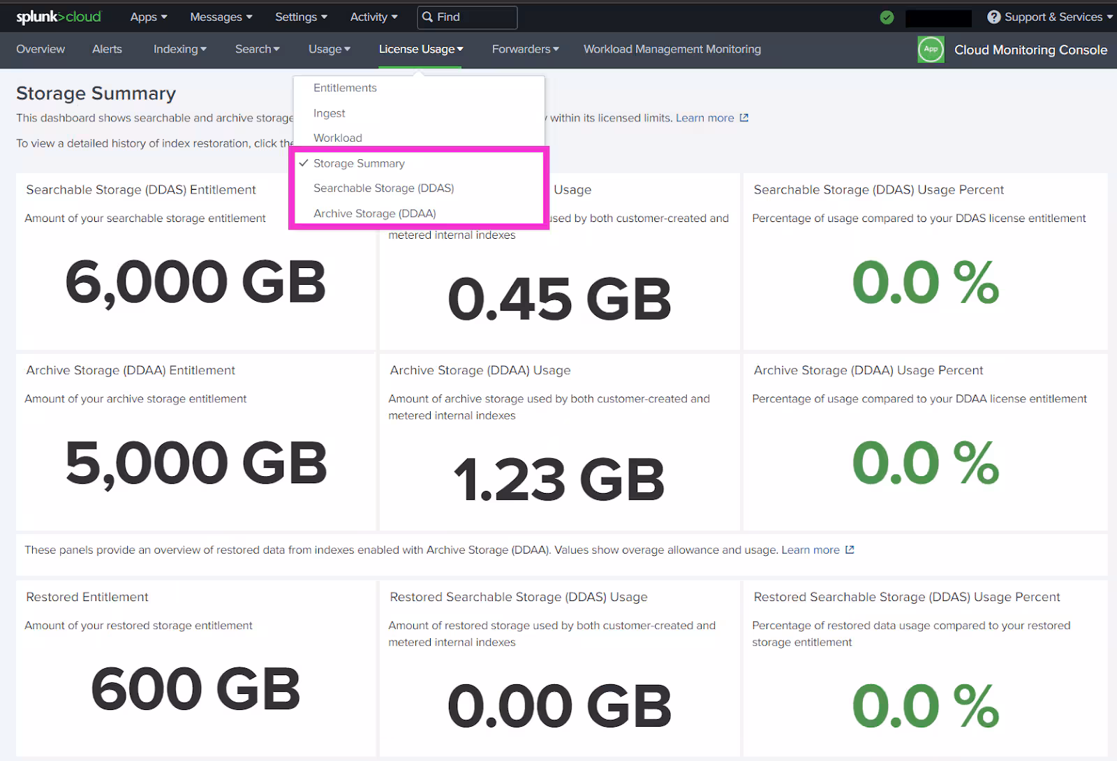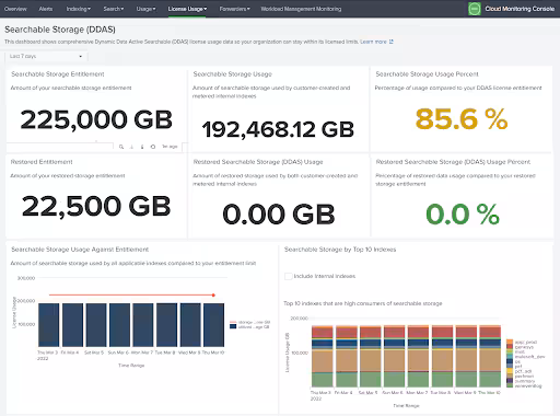 Three new dashboards have been added to the License Usage menu of the CMC app and include the following: Storage Summary, Searchable Storage (DDAS), and Archive Storage (DDAA). The dashboards provide comprehensive entitlement, usage, and data restoration overviews to help Splunk Cloud Platform administrators better manage their organizations’ license limits: