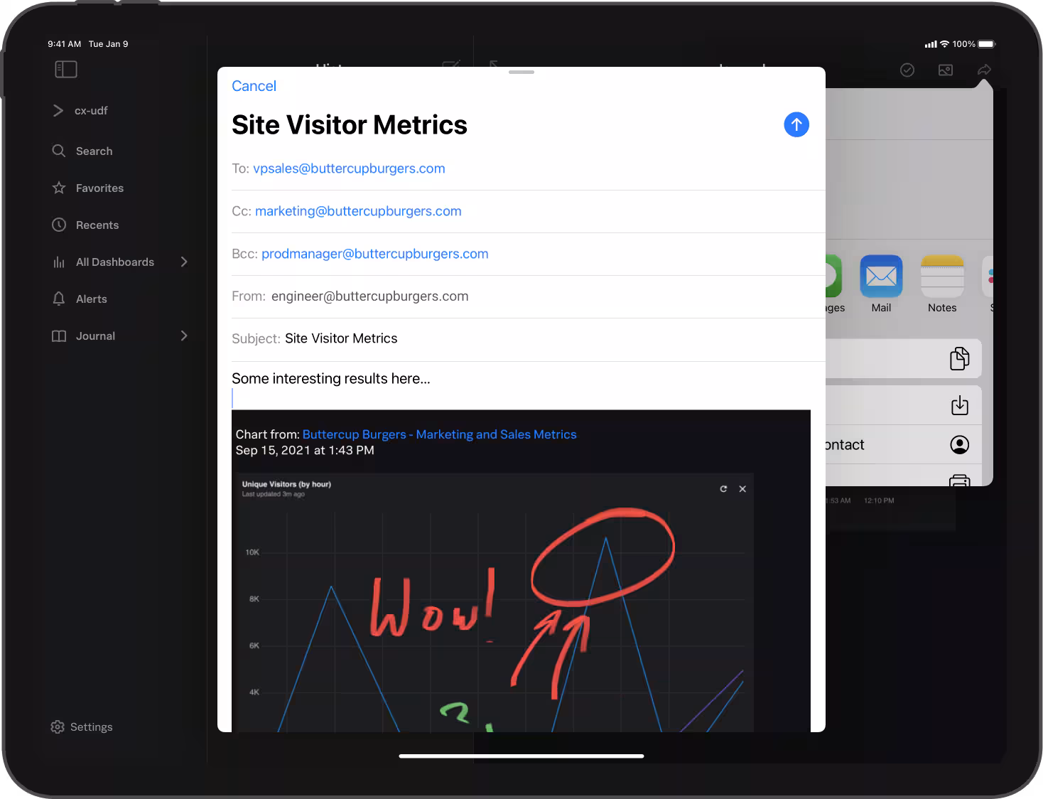 With Splunk for iPad, we introduced the Data Journal which enables you to take notes and record relevant historical context to understand your data better. You can drag and drop relevant charts and continue to add text and other images to contextualize your notes. Then, leverage the awesome collaboration tool that is Splunk for iPad by sharing entire notes with your team. Email, Slack or Messages... we’ve got you covered!