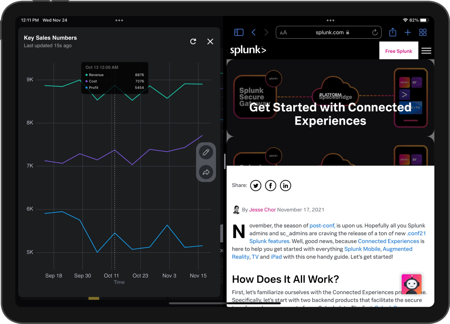 It doesn’t end here! For those extra productive users, we also support iPad OS’ enhanced multitasking capabilities so that you can have multiple windows open at once. You can compare data by opening 2 dashboards side by side, or even pair Splunk for iPad with other apps such as Slack, Mail or Safari, taking your productivity to the next level!