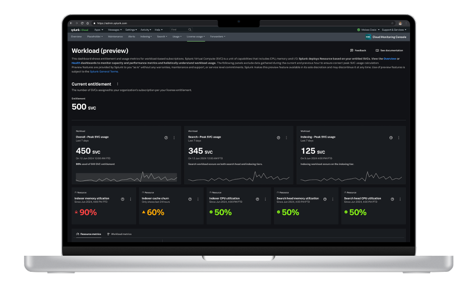 With a new navigation workflow and a streamlined single-page view, the new workload dashboard lets Splunk administrators complete tasks more efficiently and optimize Splunk Virtual Compute (SVC) and resource metric usage.
