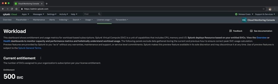 CMC’s new workload dashboard is now generally available (GA). It is a dashboard located in the “License Usage Tab” of the Cloud Monitoring Console (CMC). Splunk Cloud Platform administrators use it for workload license monitoring, capacity planning, and troubleshooting.