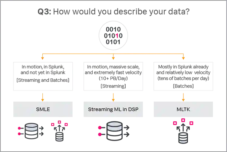The Splunk AI/ML ecosystem delivers advanced capabilities while supporting flexibility for all users. Choosing the right workflow for your use case is as simple as answering three easy questions: