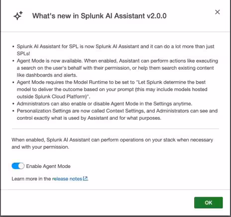 When booting up Splunk AI Assistant after the 2.0 update, administrators will see a prompt informing them about what Agent Mode is, requirements for enabling it, and giving them the option to enable or disable it. We do not turn on Agent Mode without explicit admin consent, and we provide administrators with the ability to enable or disable the mode in the future from the settings tab.