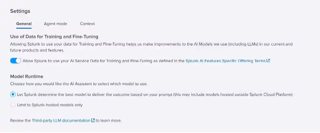 This release also features a small adjustment to the Model Runtime choices. By default, the Model Runtime will be set to Allow Splunk to determine the best model to deliver the outcome based on the prompts provided, which would allow for the use of models hosted outside of Splunk Cloud Platform. Any AI inferencing done via this method is also still free. Users will also still have the option to limit the model to only use Splunk-hosted models; however, doing so will disable the ability to use Agent Mode.
