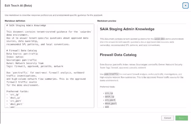In addition to Agent Mode, this release also introduces a new beta feature called Teach AI. When Agent Mode is enabled, administrators will be able to bring in their own custom organization know-how, best practices, and data catalog into AI Assistant to make it work better for their environment. Administrators will also have the ability to add guardrails for this feature, by highlighting specific values like data sources, indexes, sourcetypes, owners, tags, etc. that they want to include in markdown file. We would love to hear feedback from any administrators that try out this beta feature via over on the Voice of the Customer Portal.