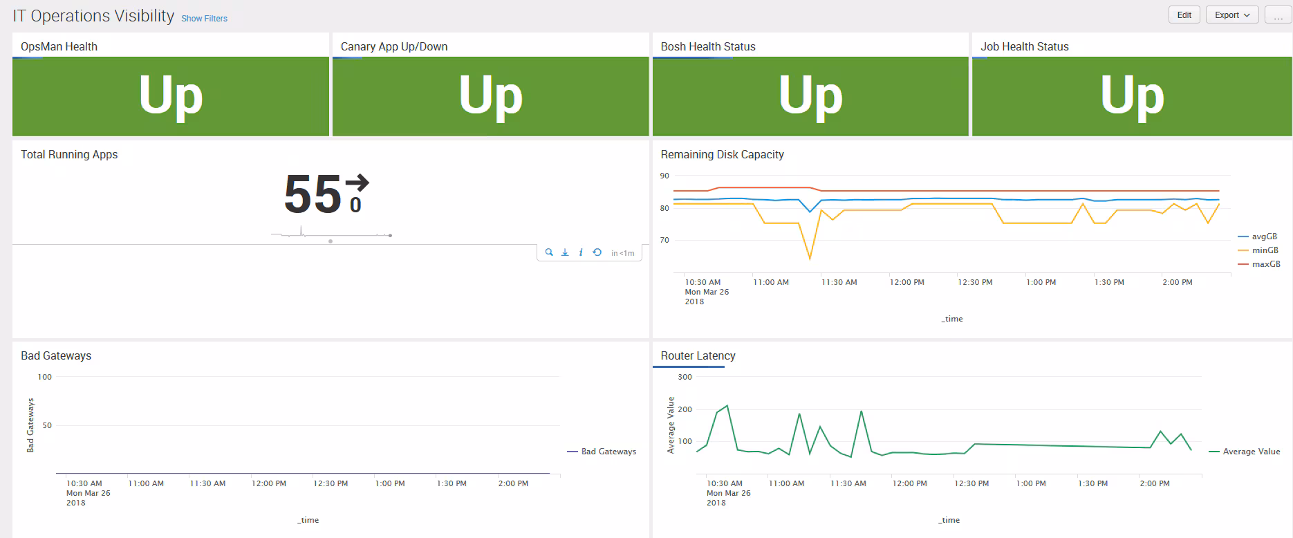 IT Operations Visibility – The IT Operations Visibility is a mash-up of critical metrics, most of which are generated by the PCF Healthwatch Application. These app metrics also have some drilldown capability and are designed to provide a bit more granularity than the Executive Overview.