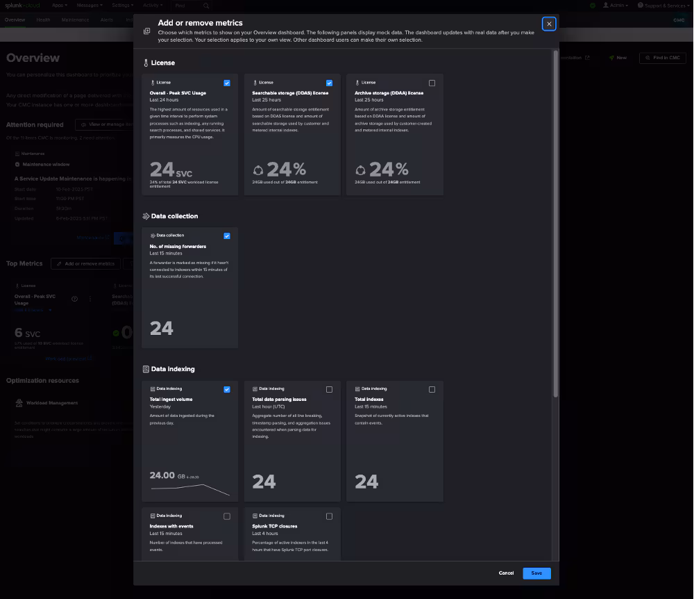 To start, take a look at the available metrics in the selection modal and choose from the available list of metrics. Here you can find license entitlement and usage info alongside key deployment metrics such as search count, ingest volume, etc. from key areas of Splunk Cloud Platform (i.e. data collection, data indexing, and data search).