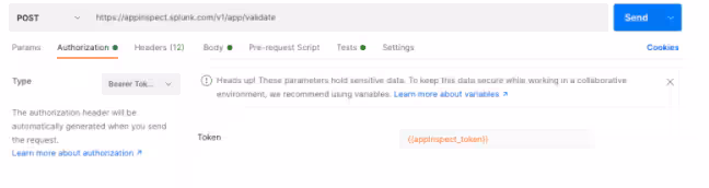 From here, we can go ahead and reference the {{appInspect_token}} variable in the Authorization section. For “Type”, select “Bearer Token”.
