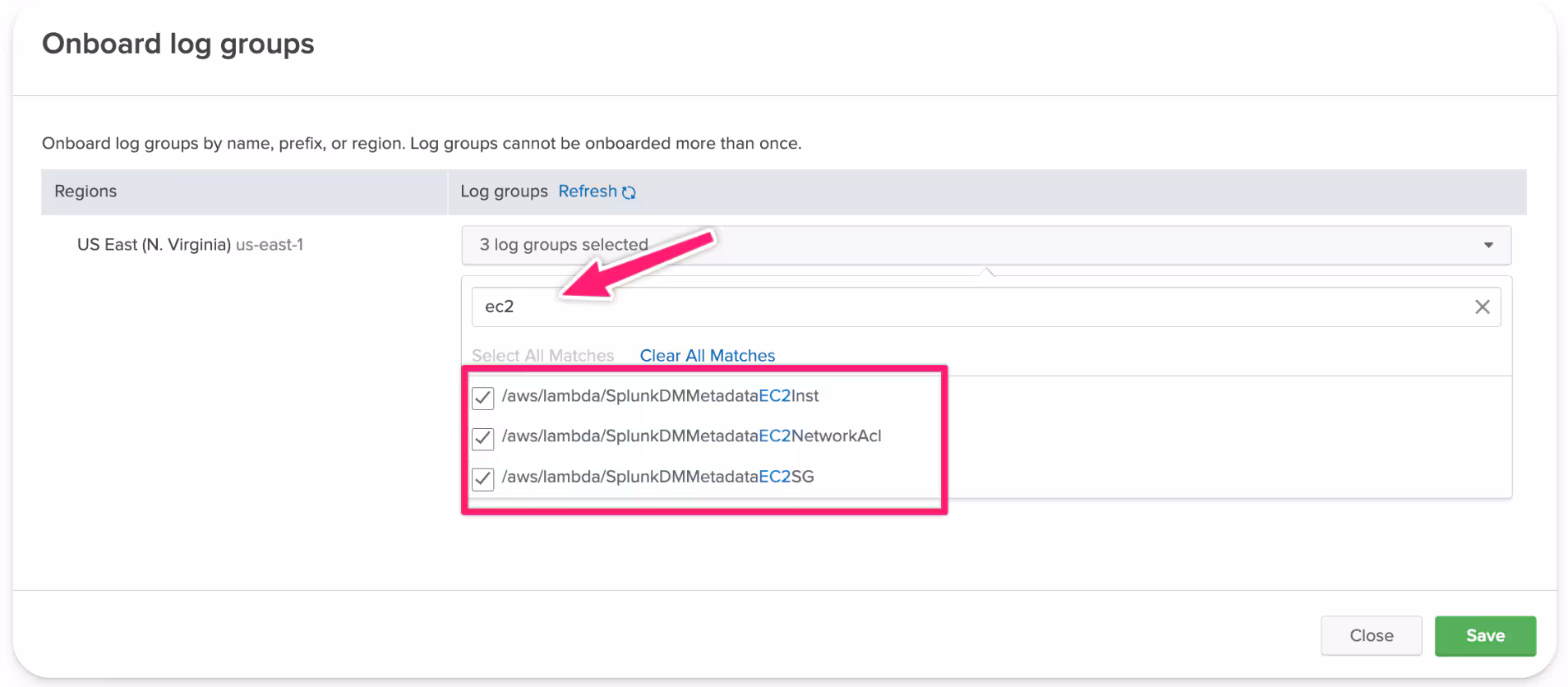 2.6. Log Group Onboarding: If the agent configuration was successful, you should be able to view logs from your EC2. You can filter names you want to onboard, or search through all available log groups.