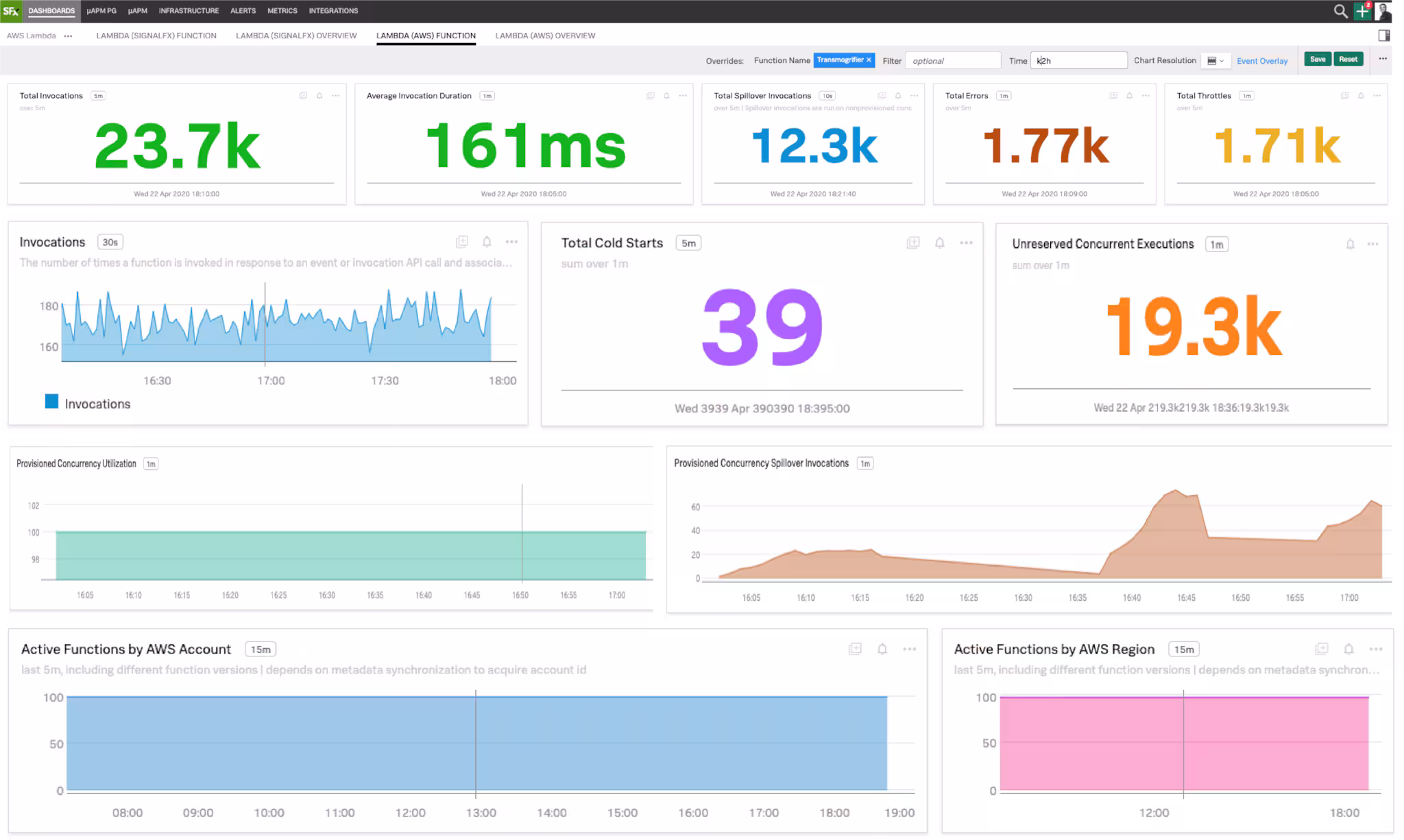 - Drill-downs to optimize performance and cost: To avoid cold starts, development teams can use the Provisioned Concurrency feature. Functions can instantaneously serve a burst of traffic with consistent start-up latency. However, you pay for the amount and the duration of provisioned concurrency. It is critical to understand how much of provisioned concurrency is used and what the percentage of spillovers is. Our pre-built dashboards give deeper insights into cold starts, concurrency, throttles and spillovers to manage under-provisioned functions, optimize latency and reduce cost.