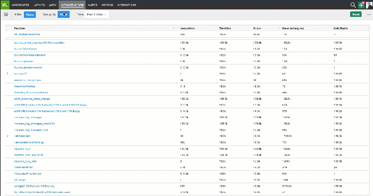 - Aggregate view for all serverless functions: A pre-built dashboard with key metrics across all serverless functions provides a bird’s-eye view to understand how your serverless architecture is performing. Quickly search, filter and sort to drill down into functions with errors, high latency or cold starts. Tag and group functions based on usage, location, account, runtime, resources or any other dimension.