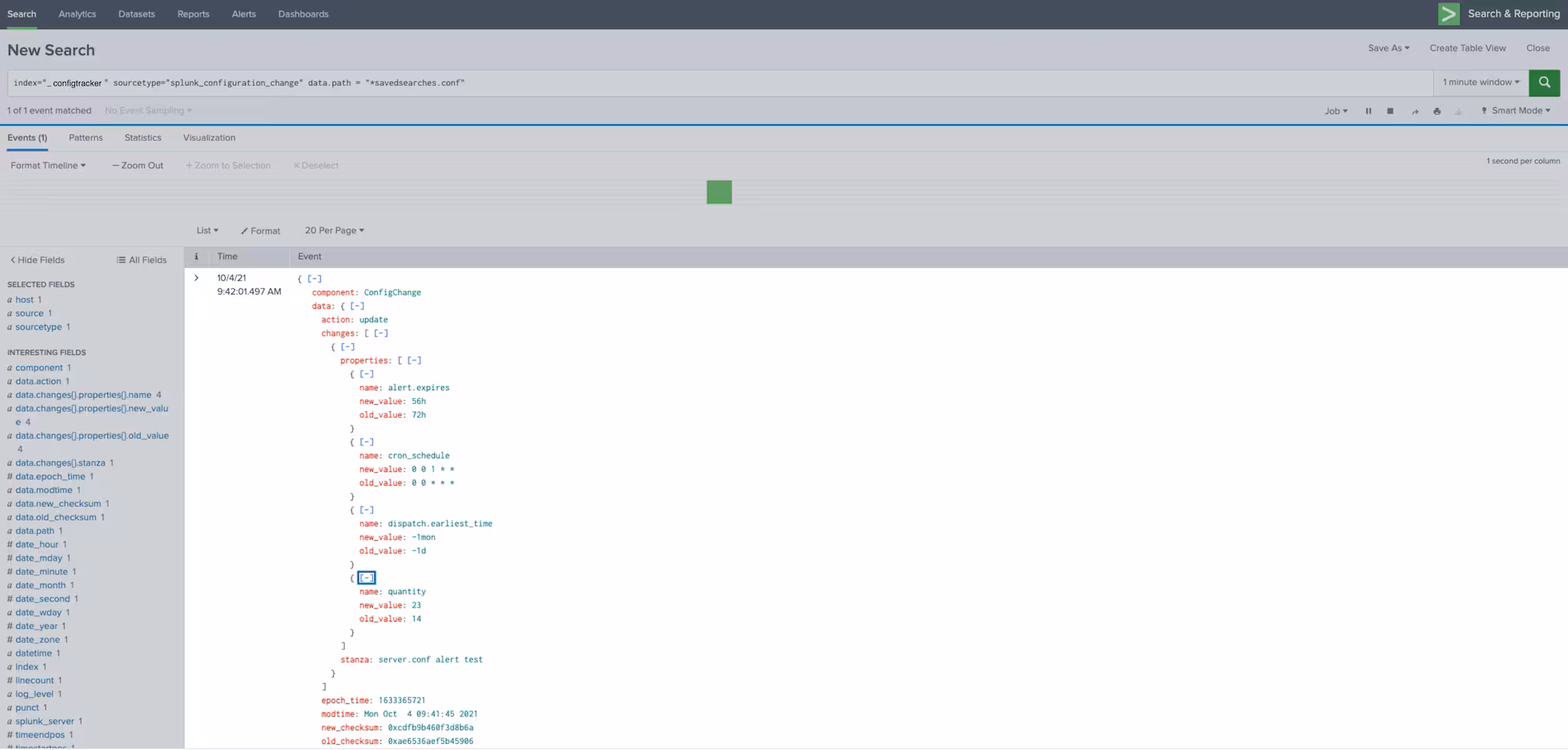 Note: UI changes don’t always map 1-to-1 with .conf file changes. For example a change of certain alert values to 24 hours may show up as null (instead of 24h) in the corresponding .conf file since it is interpreted as a default value in the filesystem. However, the .conf files changes themselves will always show up exactly as they changed in the _configtracker index.