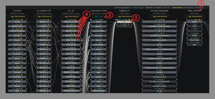 - “Events” (number of events where node is present) - “BytesIn” - total sum of all bytes transferred during HTTP request (indicator of incoming bandwidth consumed by the actor) - “Usernames” - total number of unique usernames touched by the node