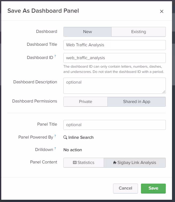 Once you filled in the dialog - click "Save As" -> "Dashboard Panel", give dashboard name - "Web Traffic Analysis" and press [Save]:
