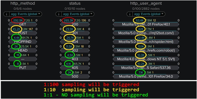 With the limit of up to 10,000 events max per field, this auto sampling logic theoretically allows visualization to work for datasets of up to 10 TRILLION EVENTS.