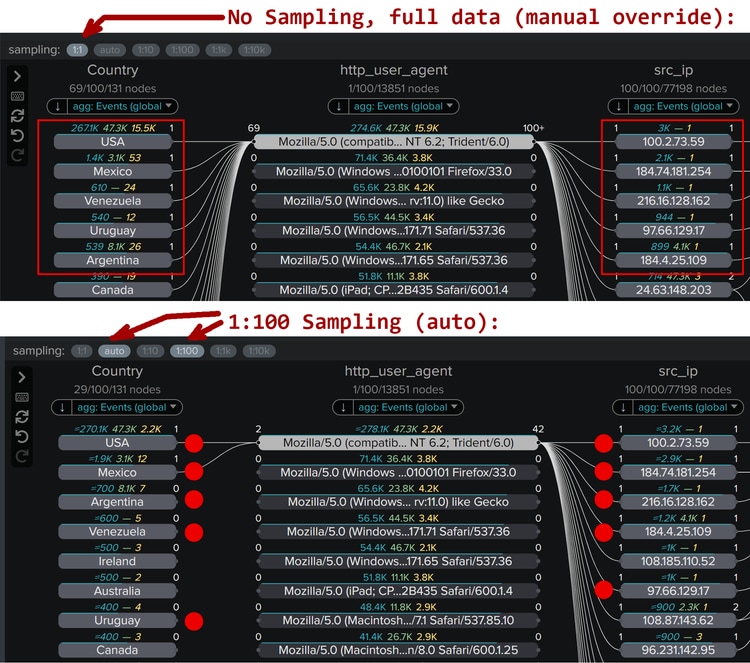 After initial loading, the visualization already knows the “stats count” number for each node (number of events for each value within top 100 values for each column) and this allows visualization to calculate sampling ratio before sending the query to Splunk.